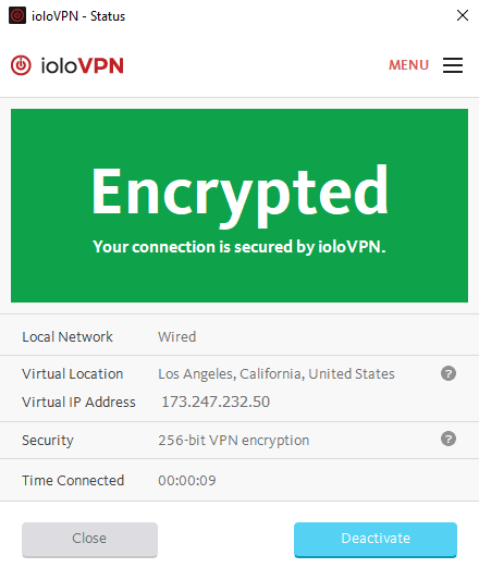 ioloVPN also assigns you a temporary private IP address from our gateway. An IP (or Internet Protocol) address is a numerical label that is assigned to devices participating in a computer network that uses the Internet Protocol for communication between its nodes. Your public IP address will be from whichever ioloVPN server you are connected to for that session. This private IP address cannot be traced by anyone nor can anyone find your real IP address or location.